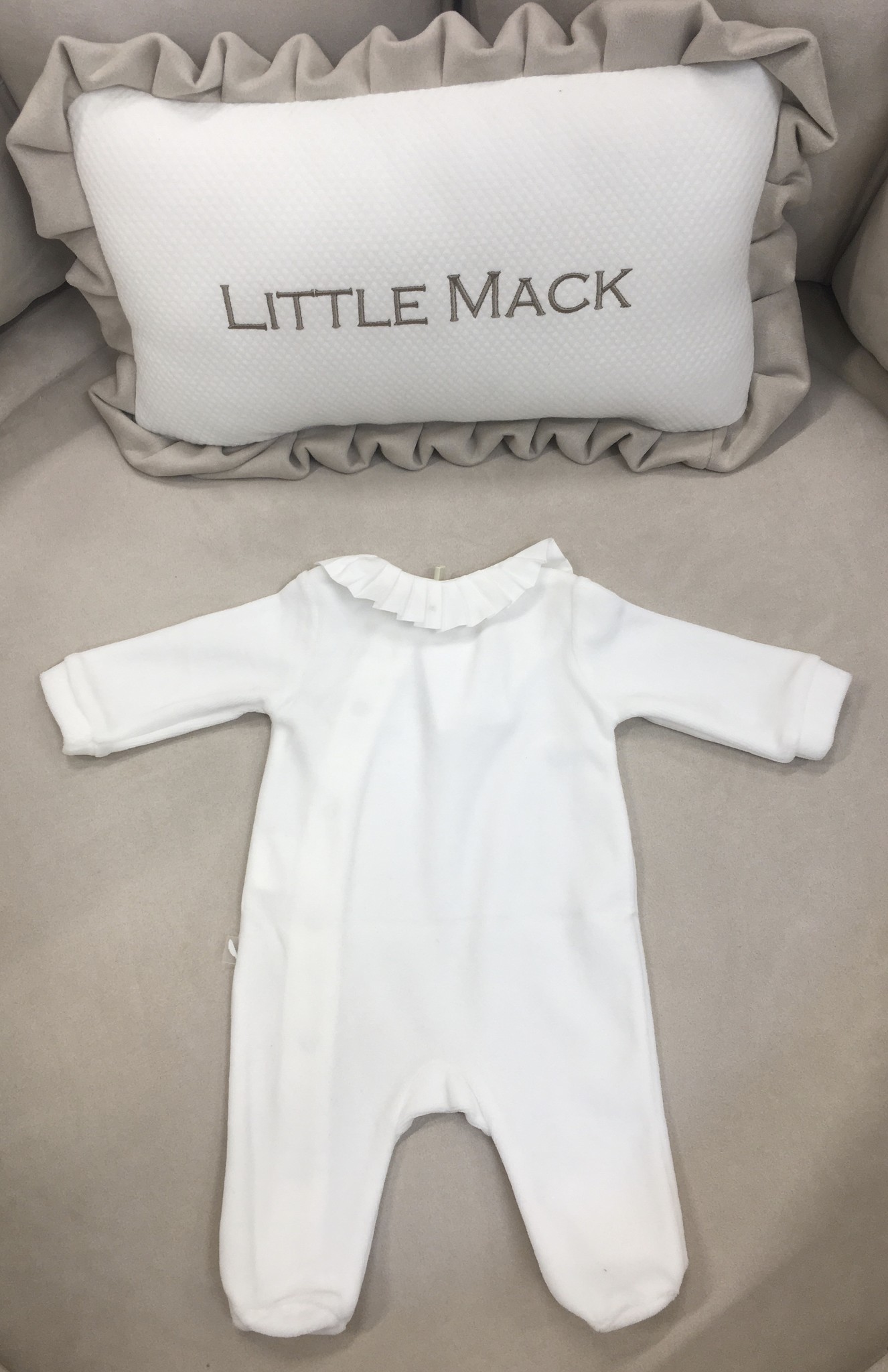 Mooi, off white babypakje met een plooikraag en drukknopen aan de voorkant voor meisjes. Van het merk Pureté.