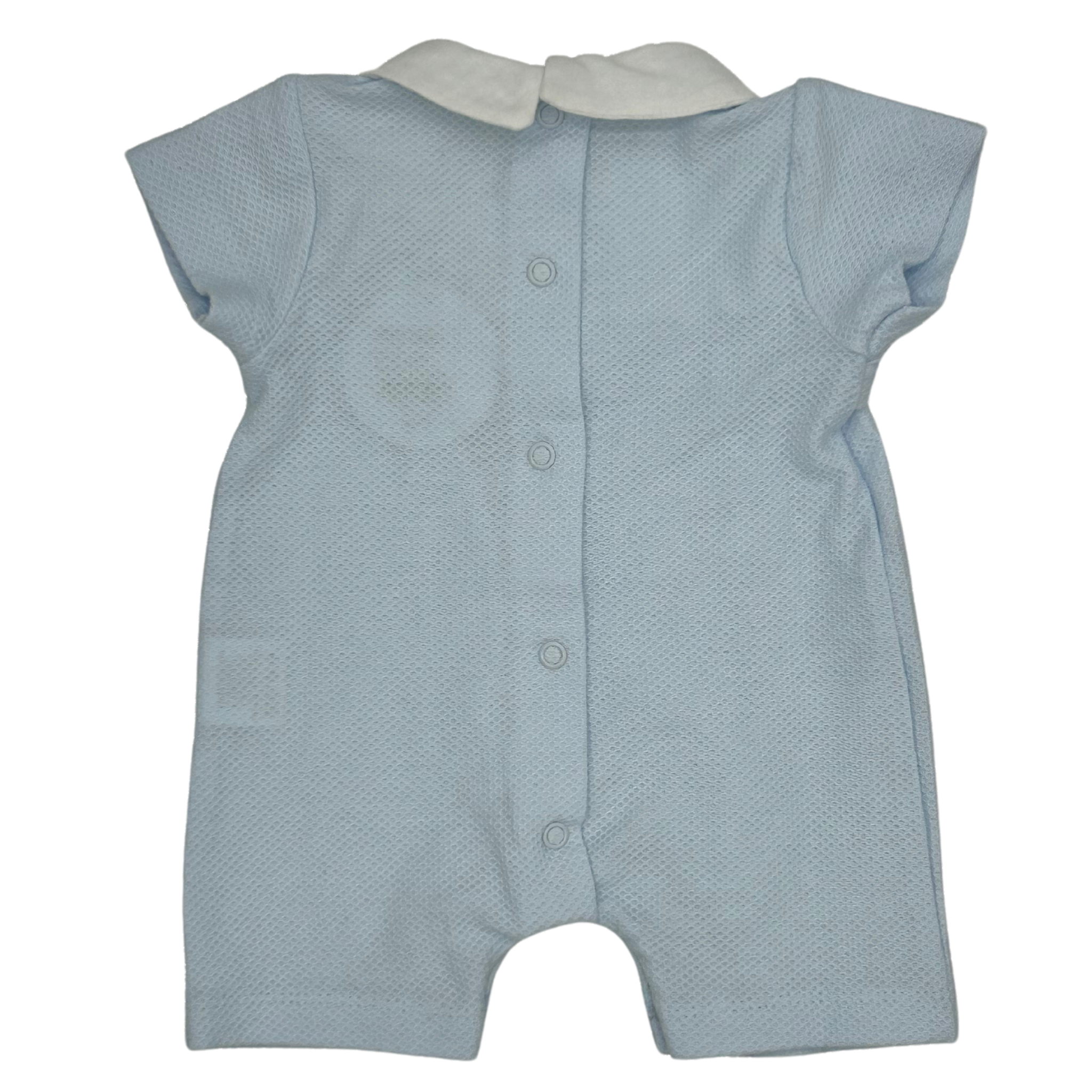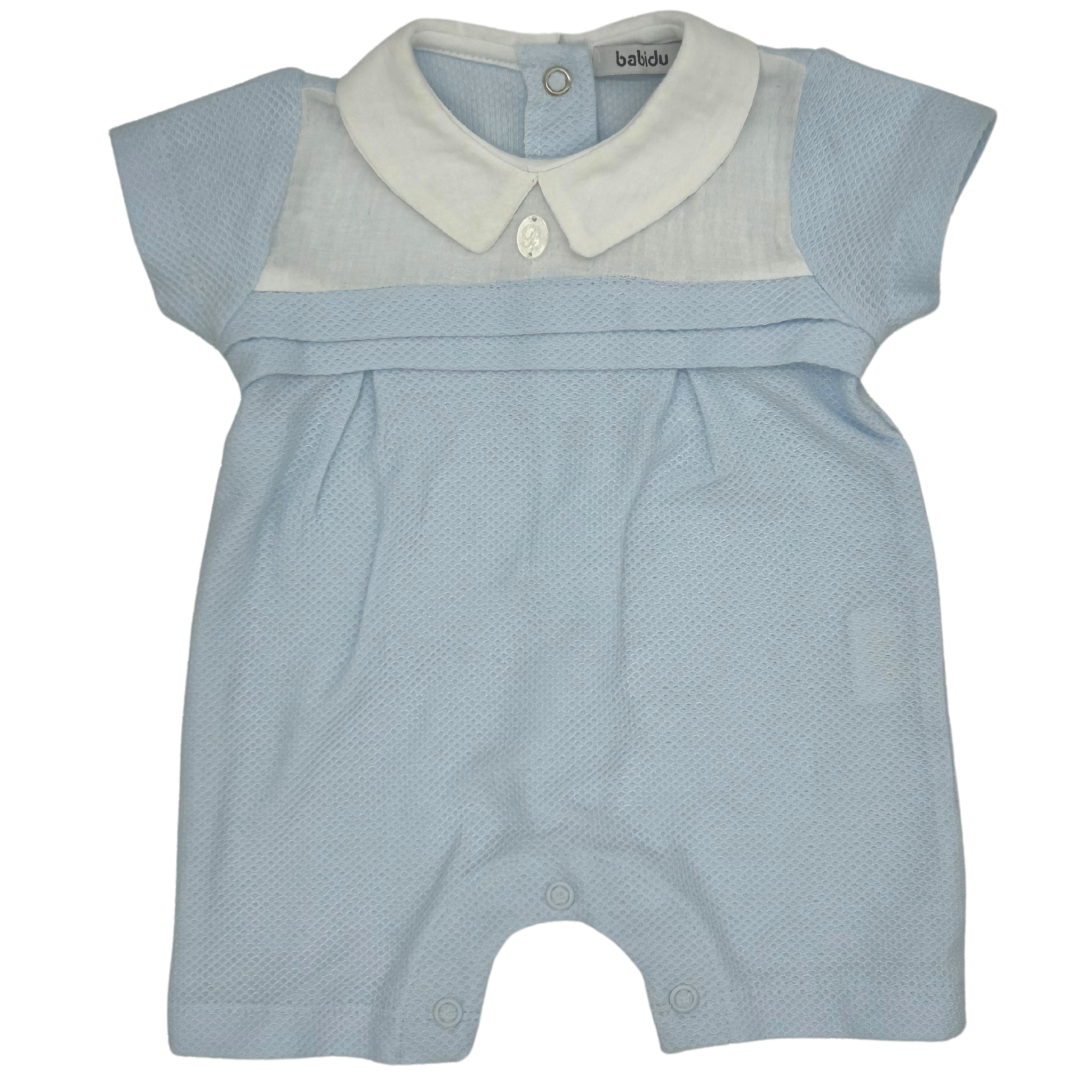 Super schattig zomer pakje voor jongens van het merk Babidu. Het pakje heeft een mooi tetra kraagje en is aan de voorkant afgewerkt met een mooi sierlijk knoopje met het merk logo erop. Het pakje is fijn aan en uit te trekken d.m.v. de drukknoopjes bij het kruis en aan de achterkant.