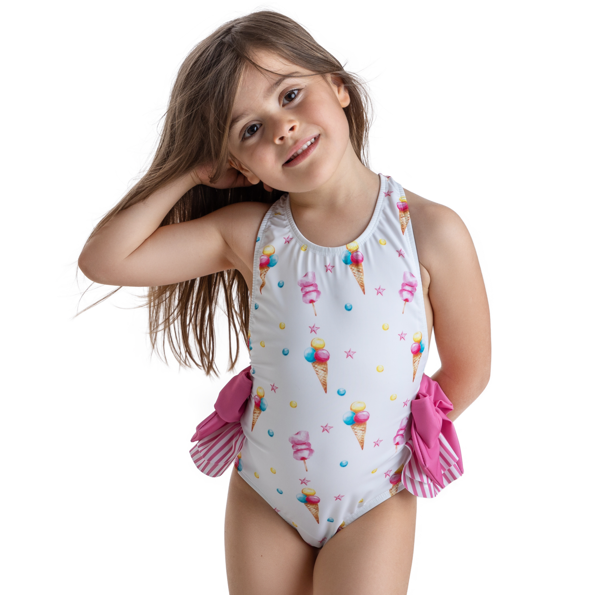 Leuk en mooi badpak voor meisjes. Met ijsjes patroon. Dit badpak kan gematcht worden met de bloomer voor het zusje die hetzelfde ijsjes patroon heeft. Van het merk Meia Pata.