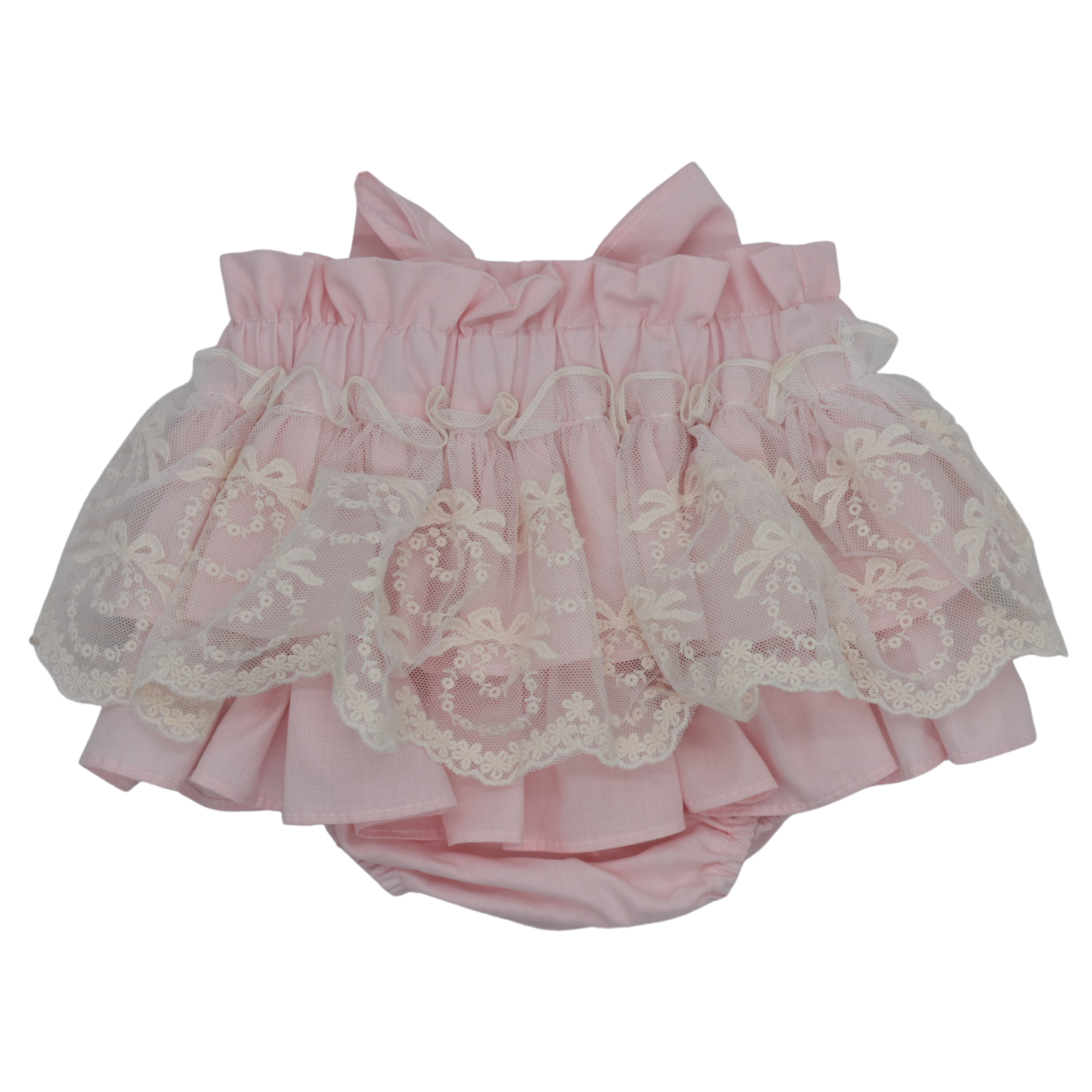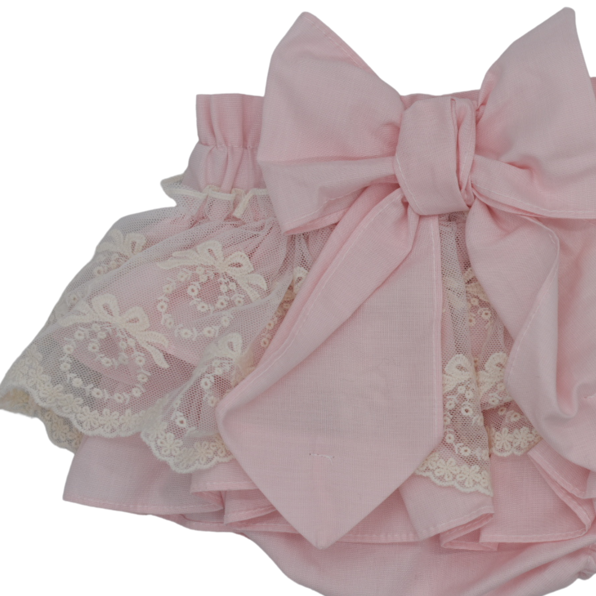 Bloomer in mooie lichtroze kleur. De katoenen bloomer van het Portugese merk Fofettes is afgewerkt met een mooie kanten ruche rand met strikjes patroon. Aan de achterzijde heeft hij een grote strik.