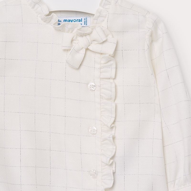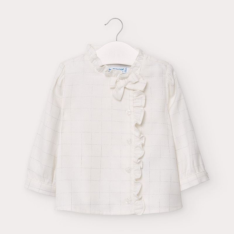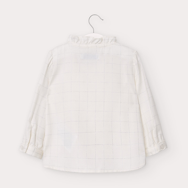 Blouse met lange mouwen voor meisjes van 6 tot 36 maanden. De blouse heeft een hoge kraag, knoopsluiting aan de voorkant. Van het merk Mayoral.