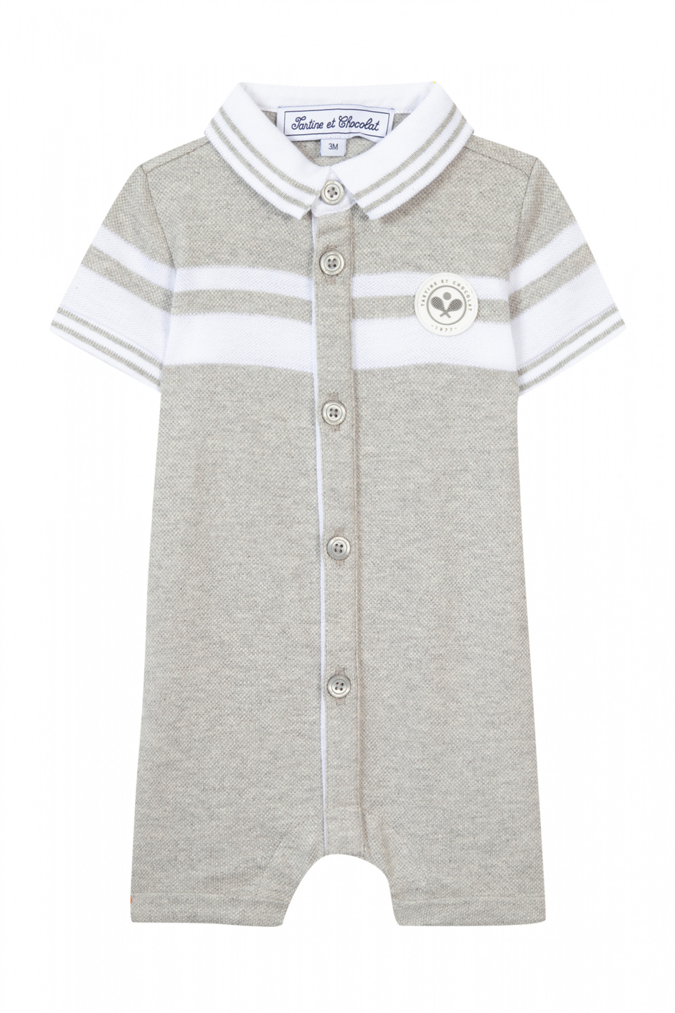 Boxpakje van het merk Tartine et Chocolat, dit mooie maar ook stoere grijs gemêleerde pakje is afgewerkt met witte details en merk applicatie op de borst. Het pakje heeft aan de voorzijde knoopjes en tussen de beentjes drukknoopjes voor het makkelijk verschonen van het kindje.