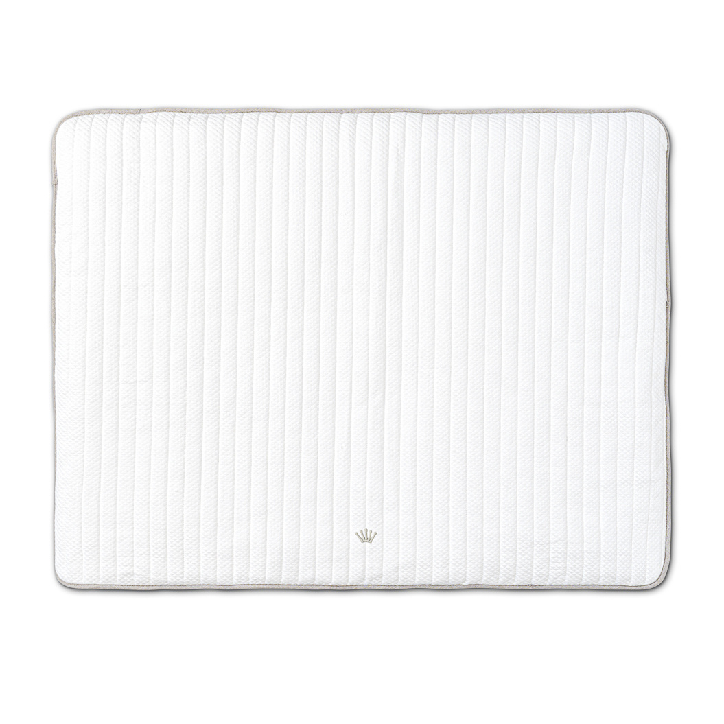 Dubbelzijdig boxkleed van gewatteerde witte jersey, gevoerd met camel eco-bont, afgezet met beige katoen. Artikel uit de Ethnic White collectie. Van het merk First (My First Collection).
