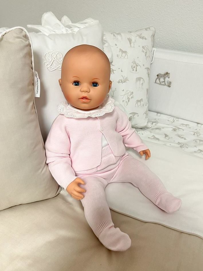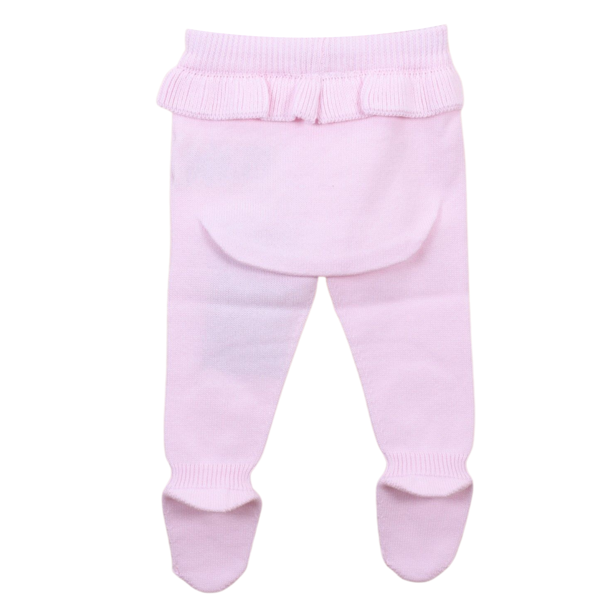Fijn gebreid katoenen broekje van het merk Wedoble, het broekje is aan de bovenkant afgewerkt met een sierlijke ruche rand en heeft voetjes. Fijn broekje voor de newborn. baby. Bij dit broekje zit ook een mooi bijpassend vestje.