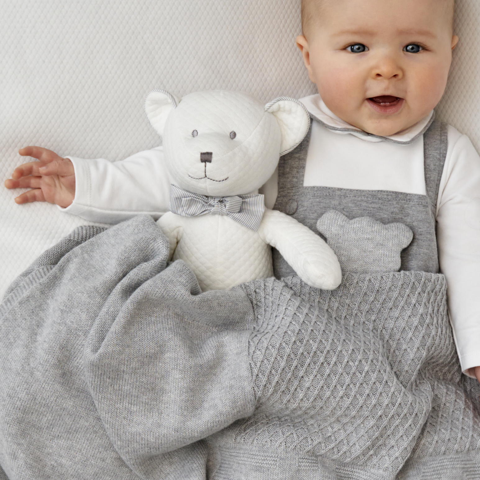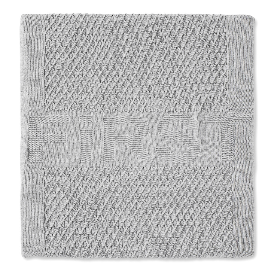 Grijze gebreide deken van 100% katoen. Artikel is te combineren met alle grijze collecties. Van het merk First (My First Collection).