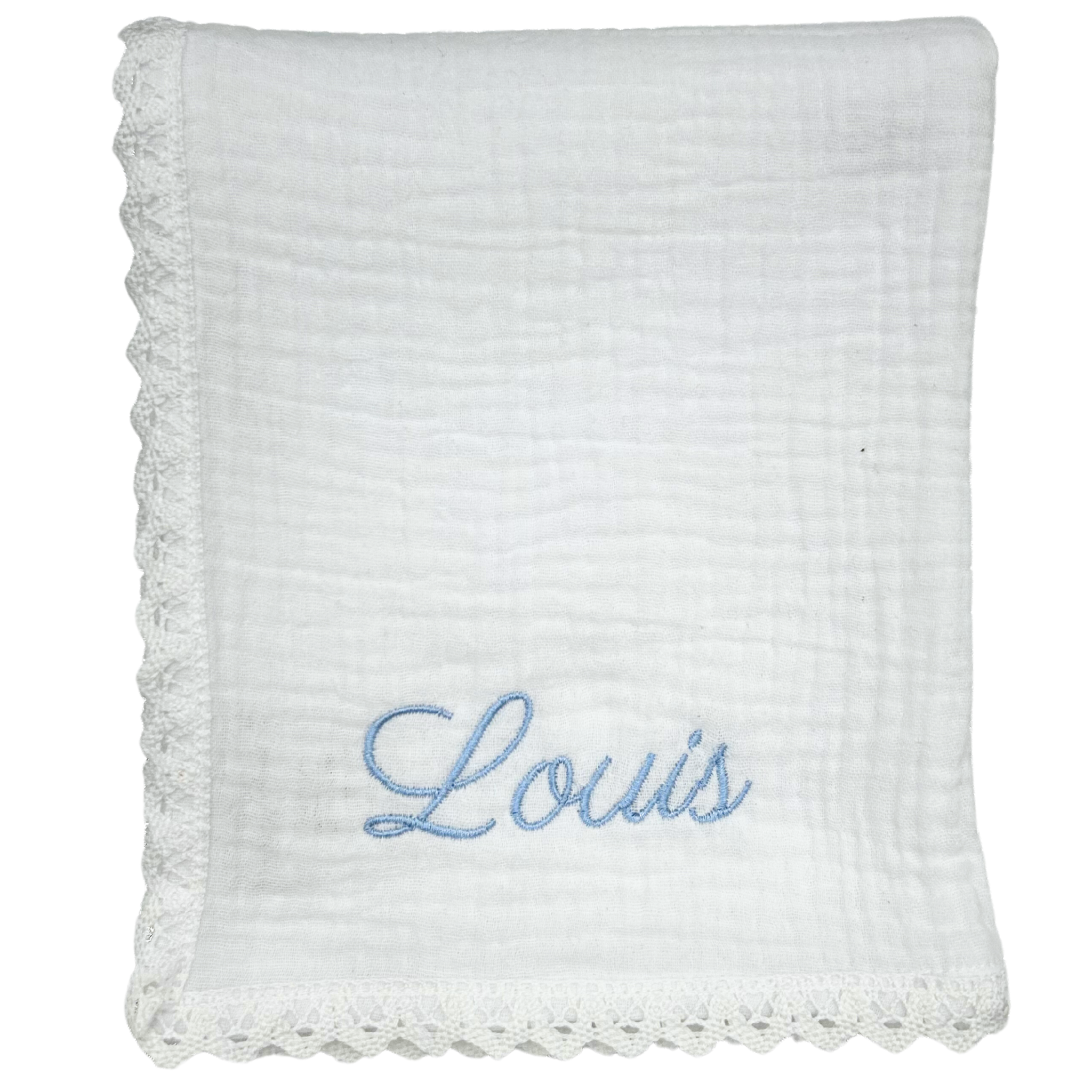 Mooie, te personaliseren hydrofiele doek.De doek is is afgewerkt met een mooie kanten sierrand. De hydrofiel kan gepersonaliseerd worden met de naam van het kindje. Hij kan gepersonaliseerd worden in blok of sierletters.