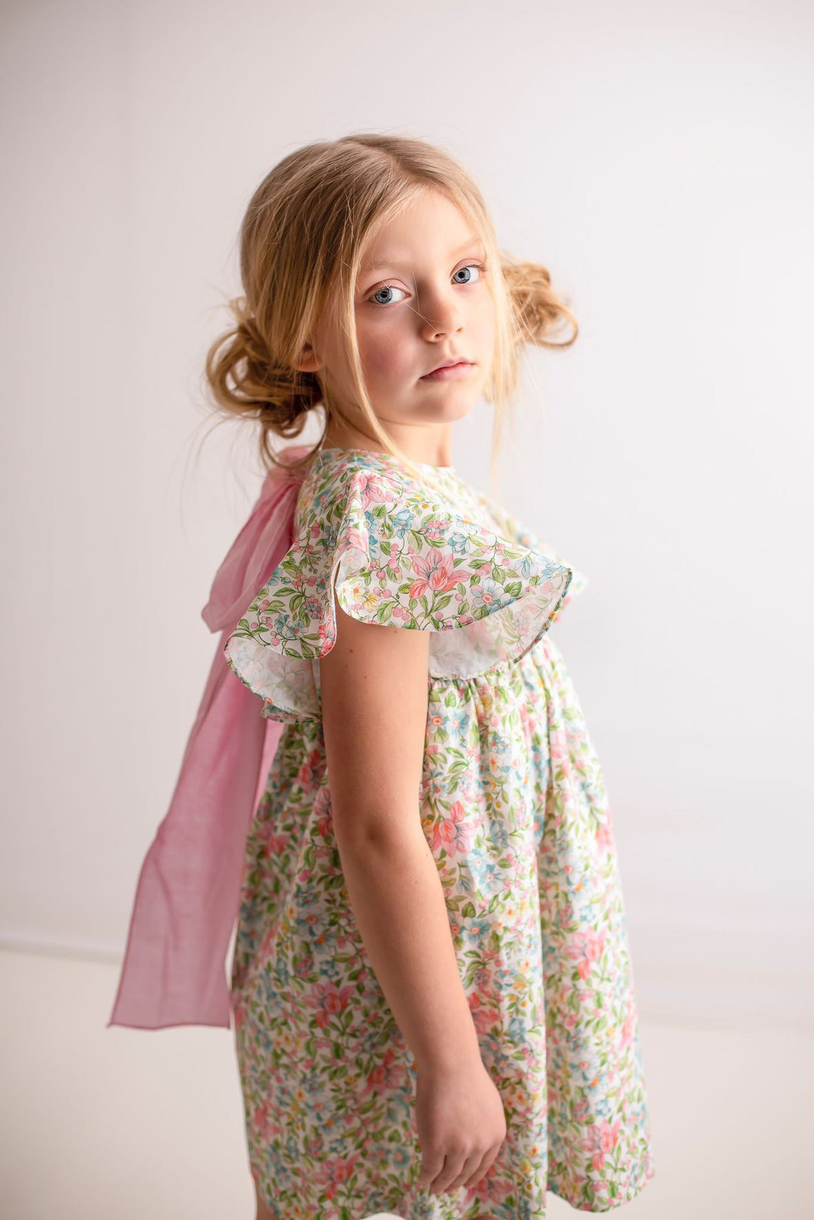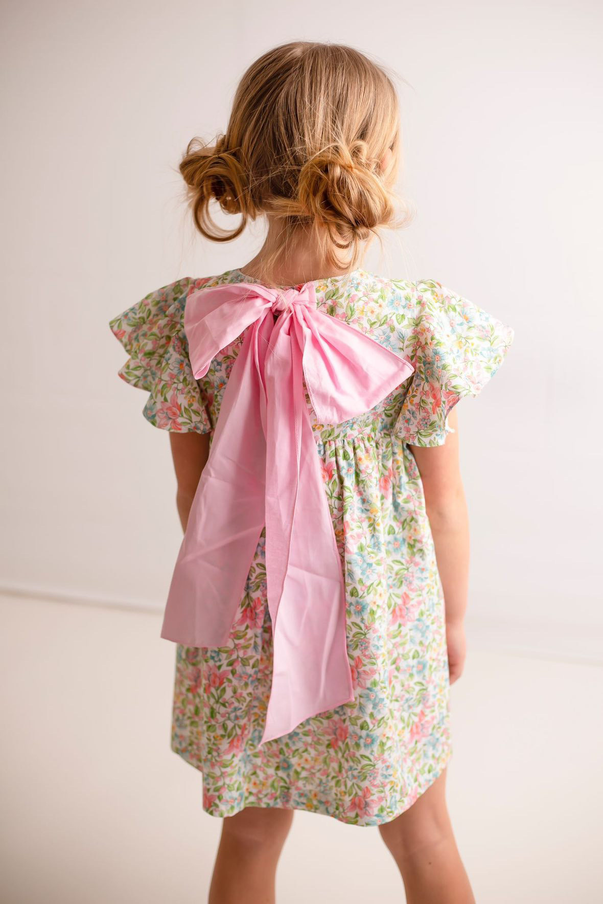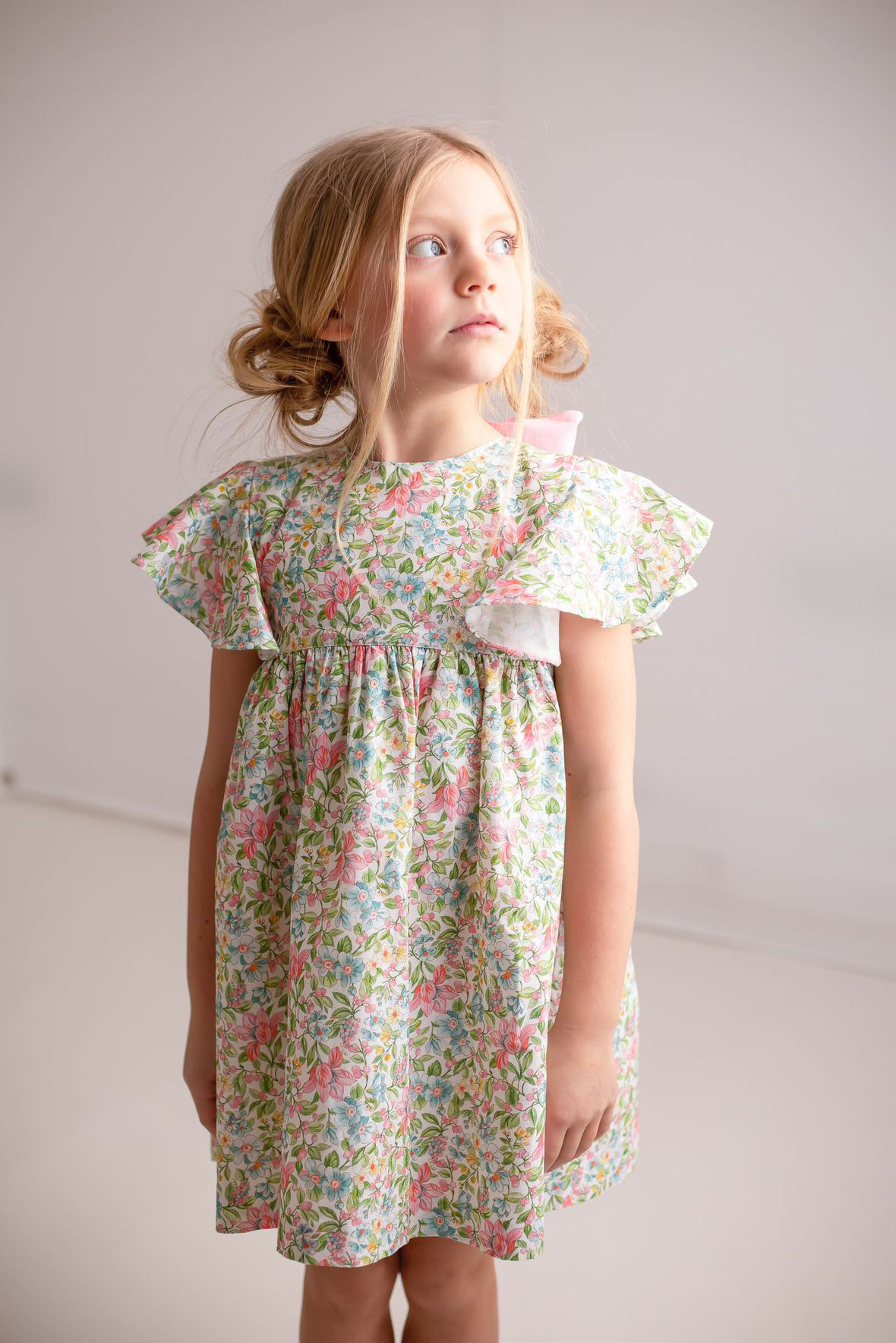 Prachtige jurk van stevig katoen. De jurk heeft een mooie fijne bloemenprint en is aan de achterkant afgewerkt met een grote roze strik. Het leuke is dat deze jurk matching kan met de romper voor het kleine zusje.