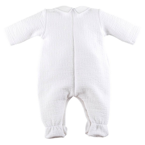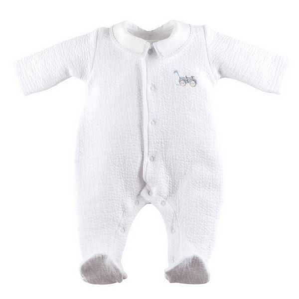 Luxe gewafeld jersey kruippakje met kraagje, het pakje is aan de voorkant versierd met een delicaat borduurwerk van Theophile & Patachou, de kraag is afgewerkt met een mooi blauw stiksel.