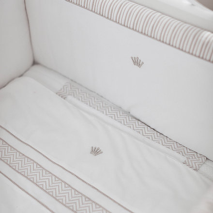Ledikant laken set van wit katoen met beige borduursels (incl. kussensloop). Artikel uit de Ethnic White collectie. Van het merk First (My First Collection).