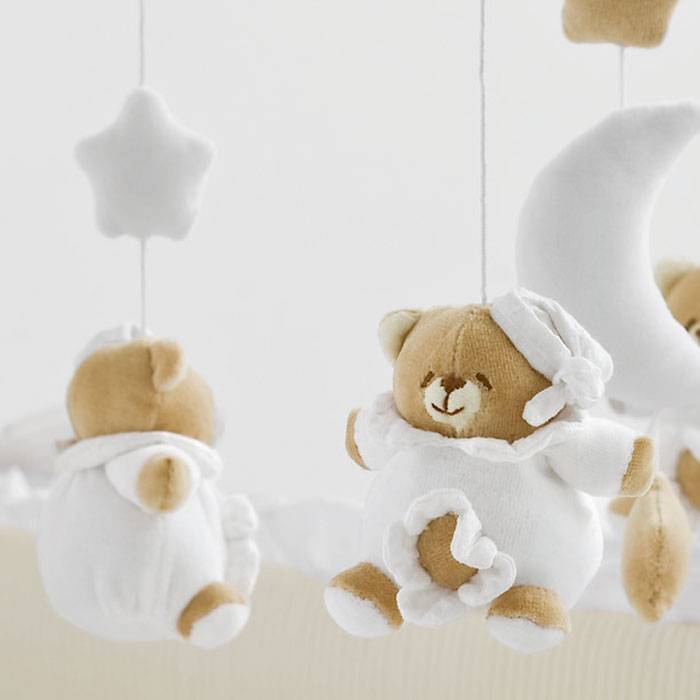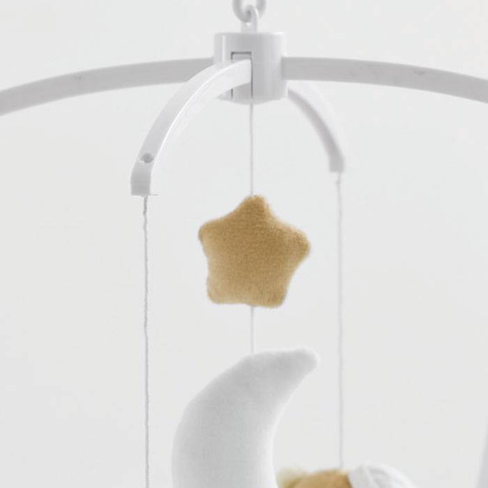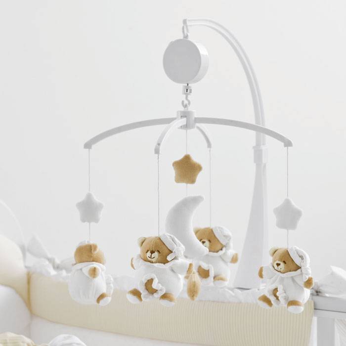 De Nanan Tato muziekmobiel heeft vier zachte teddyberen die samen een muziekel carrousel vormen om de eerste percepties van het kindje te stimuleren. Je kunt de mobiel bevestigen aan het baby bedje of de box.