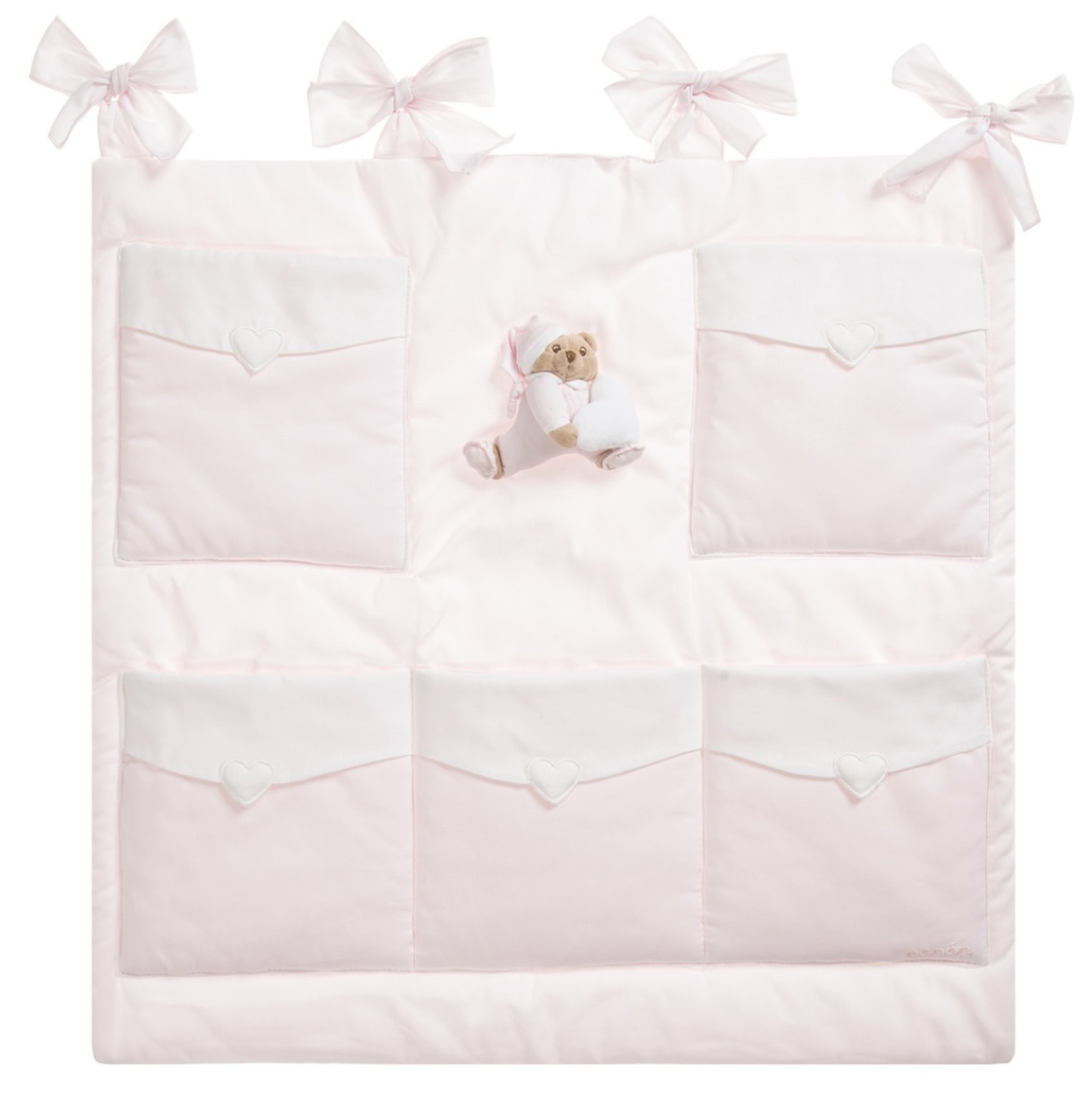Nanan Puccio opbergzak met vijf handige vakken waar alle essentiële dingen in kunnen worden opgeborgen voor de baby. Denk aan luiers, spuugdoekjes en speeltjes. Hij is gemakkelijk te bevestigen aan het babybedje of de box. Uitgevoerd met de zachte Puccio beer. de zak is gemakkelijk te wassen.