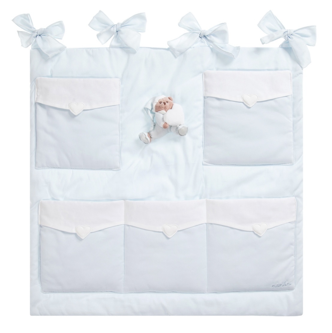 Nanan Puccio opbergzak met vijf handige vakken waar alle essentiële dingen in kunnen worden opgeborgen voor de baby. Denk aan luiers, spuugdoekjes en speeltjes. Hij is gemakkelijk te bevestigen aan het babybedje of de box. Uitgevoerd met de zachte Puccio beer. de zak is gemakkelijk te wassen.