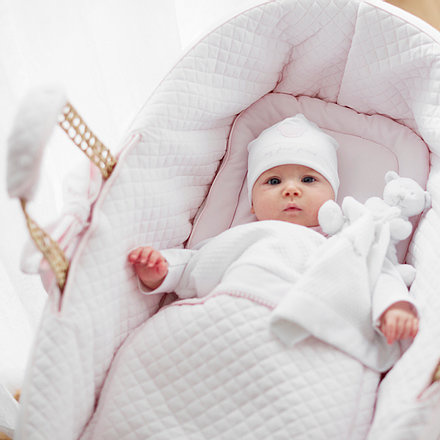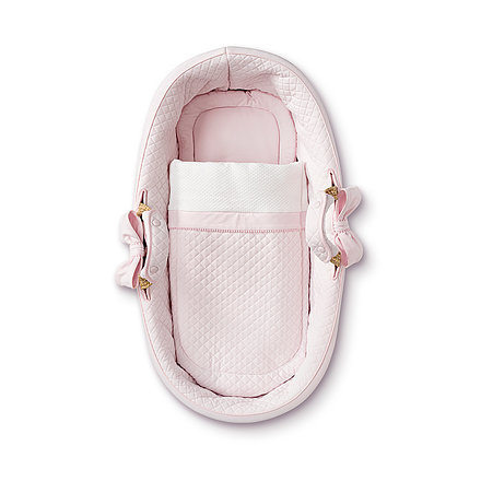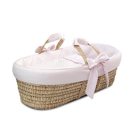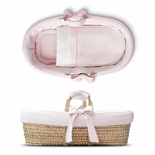 De 'First' reismand is gemaakt van 100% volledig natuurlijk, geweven palmbladeren. De set bevat de exclusieve 'First' gewatteerde jersey bumper, 2 afneembare strikken (met drukknopen), een matras met een afneembare jersey hoes en een beddengoed set van wit gewatteerde jersey. Artikel uit de Pretty Pink collectie. Van het merk First (My First Collection).