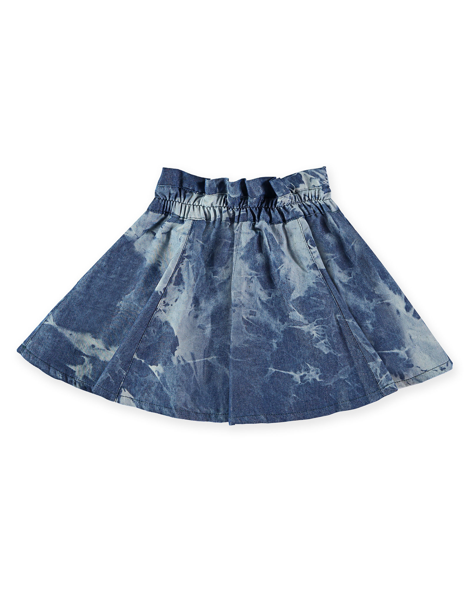 Tie- Dye jeans rokje van het Spaanse merk Pan Con Chocolate. Het uitlopende rokje met elastische tailleband is afgewerkt met een mooie strik aan de voorzijde.
