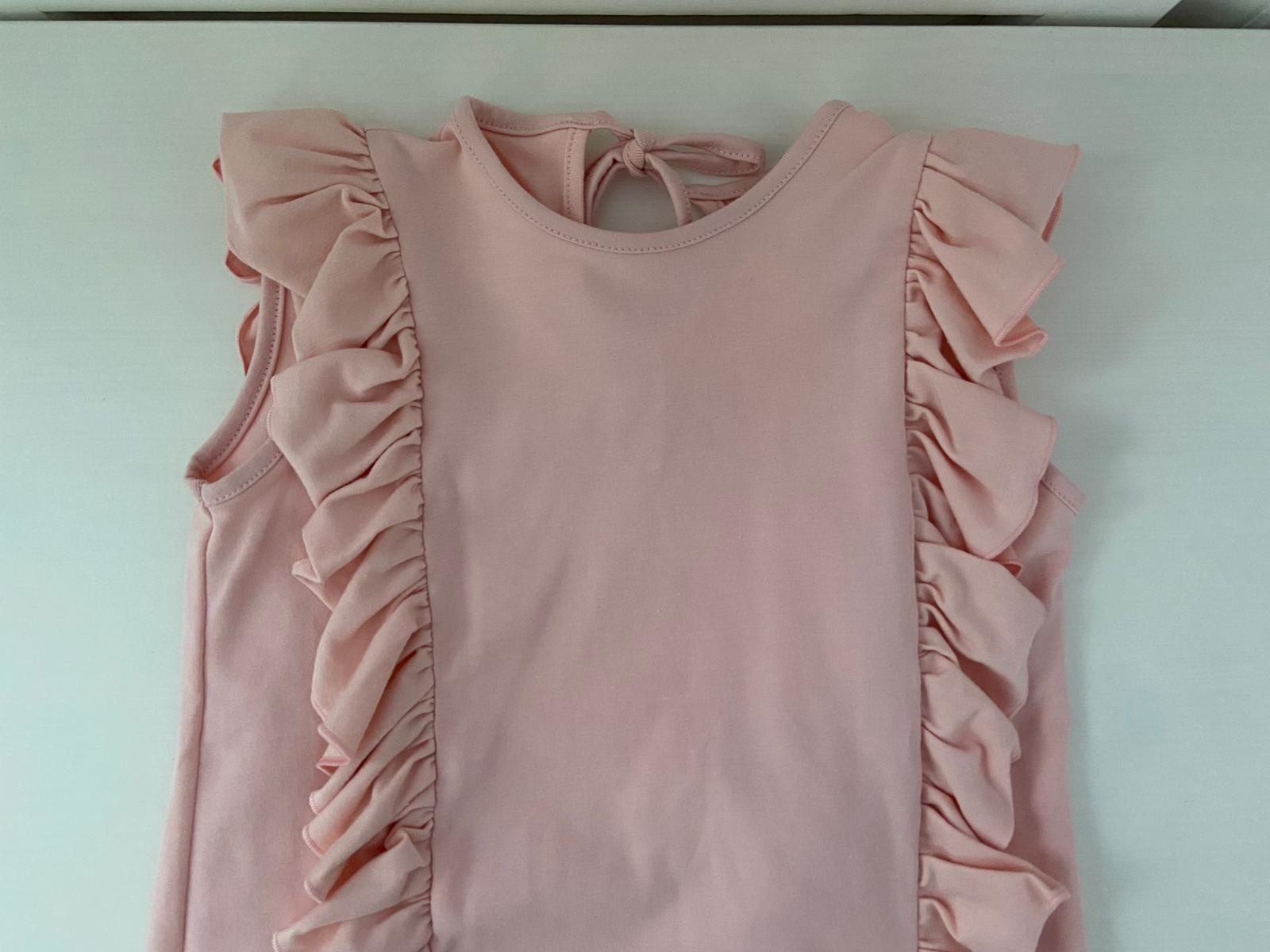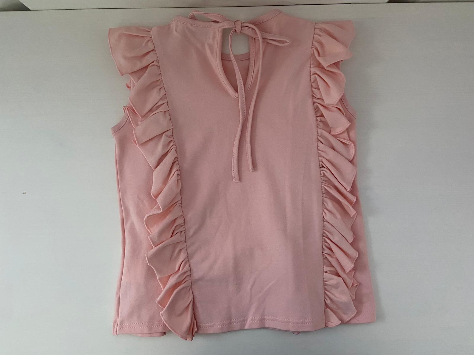Roze shirt versiert met ruches aan beide kanten van het shirt.