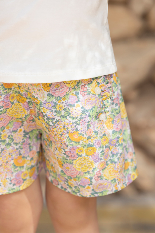 Fijne dunne short uit de Liberty lijn van het merk Tartine et Chocola. Het shortje is afgewerkt met een mooie sierrand en mooie parelmoer kleurige knoopjes rondom de zakjes. Het liberty motief in geel, lila en roze tinten is een terugkomend motief dit seizoen. Stijl dit broekje af met de schoentjes, romper of het shirt uit deze lijn van dit merk.