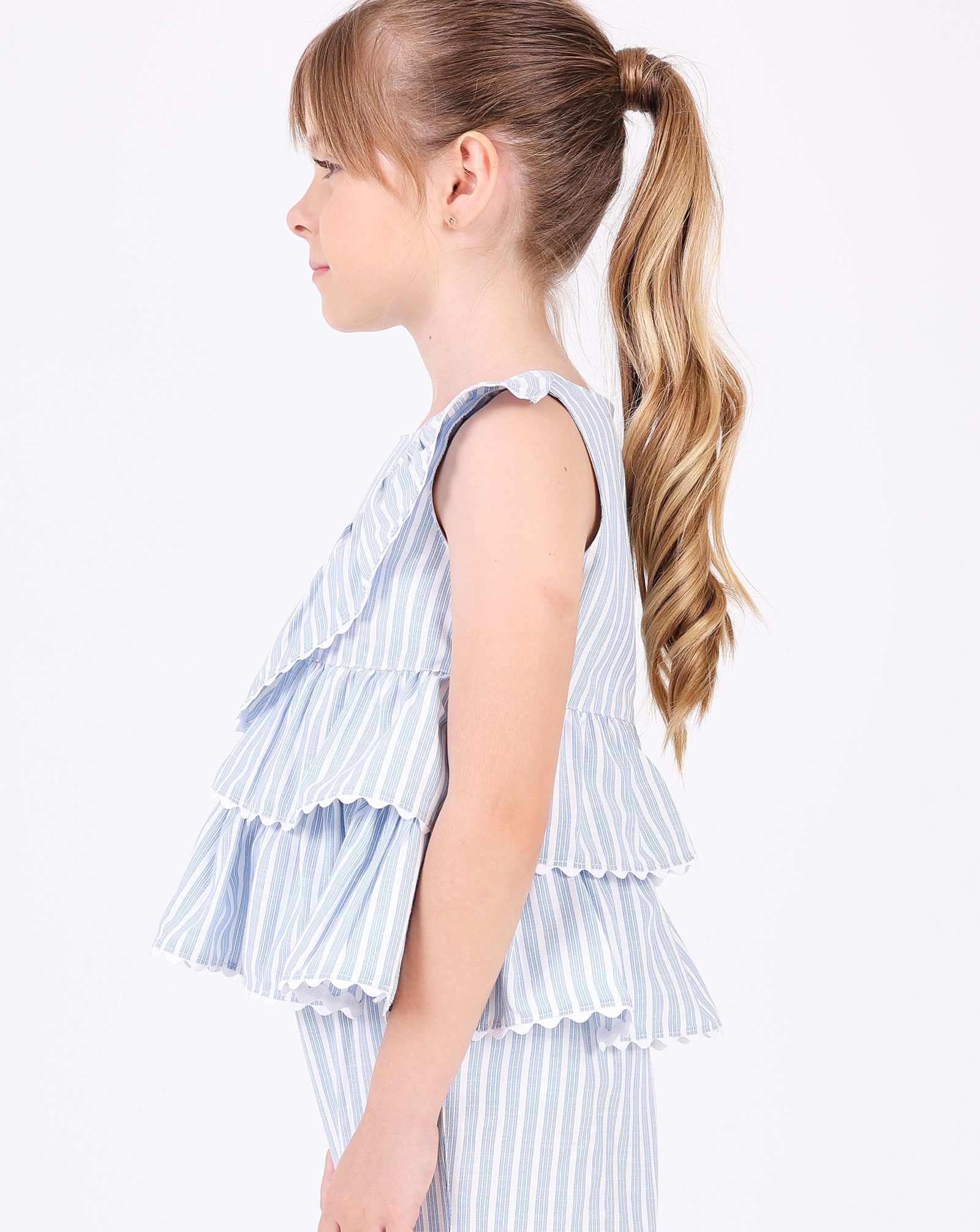 Mooie blauw/wit gestreept shortje van het merk Pan Con Chocolate. Het broekje heeft een elastische tailleband en is aan de voorkant afgewerkt met een strik. Bij de short zit een bijpassend blouse