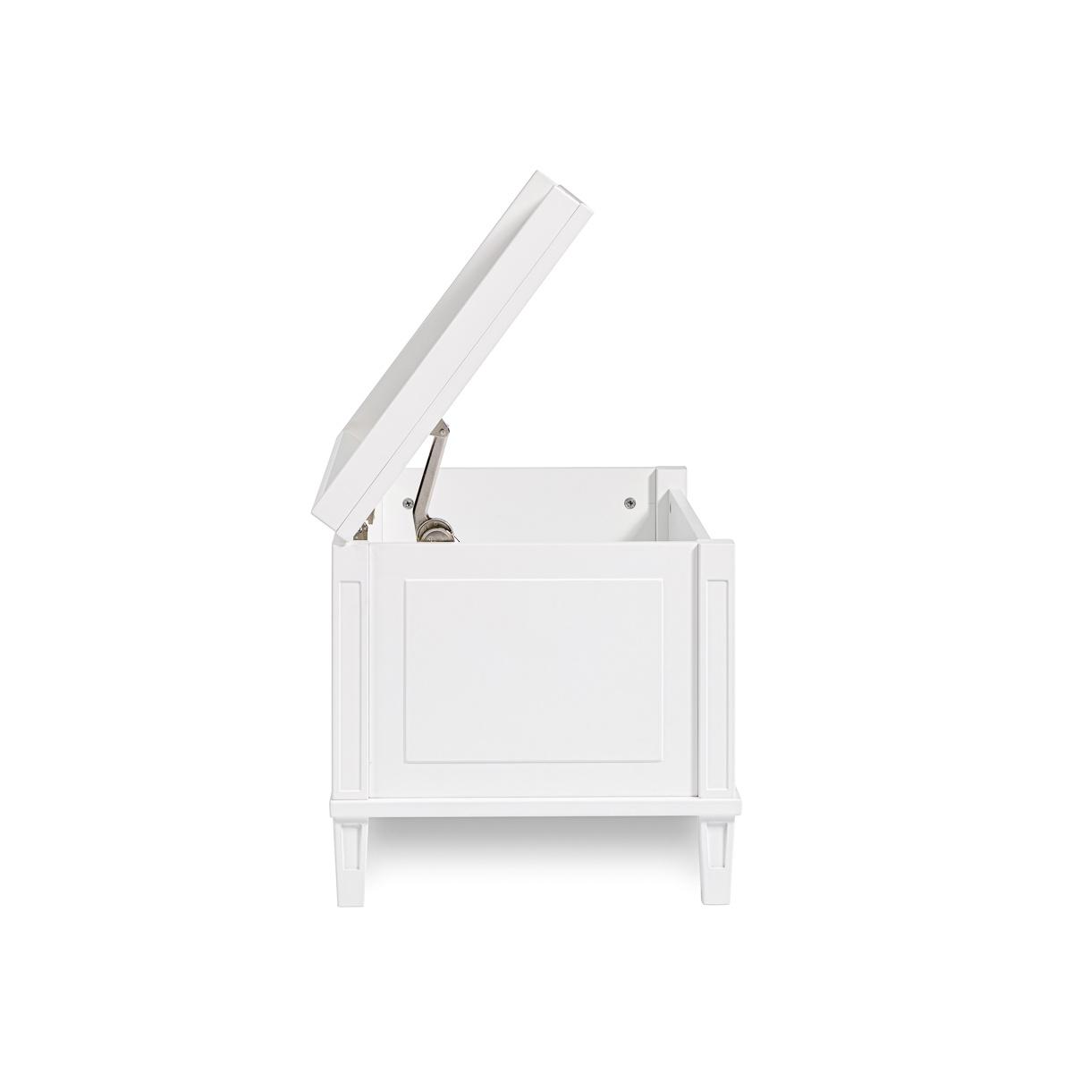 De speelgoedkoffer is gedeelte voor gemonteerd en gemakkelijk in elkaar te zetten, bestaat uit wit MDF met ondersteunende zijkanten, softclose bovendeel van de bovenkant. Het is gemaakt van geverfde vezelplaat (MDF) en spaanplaat.