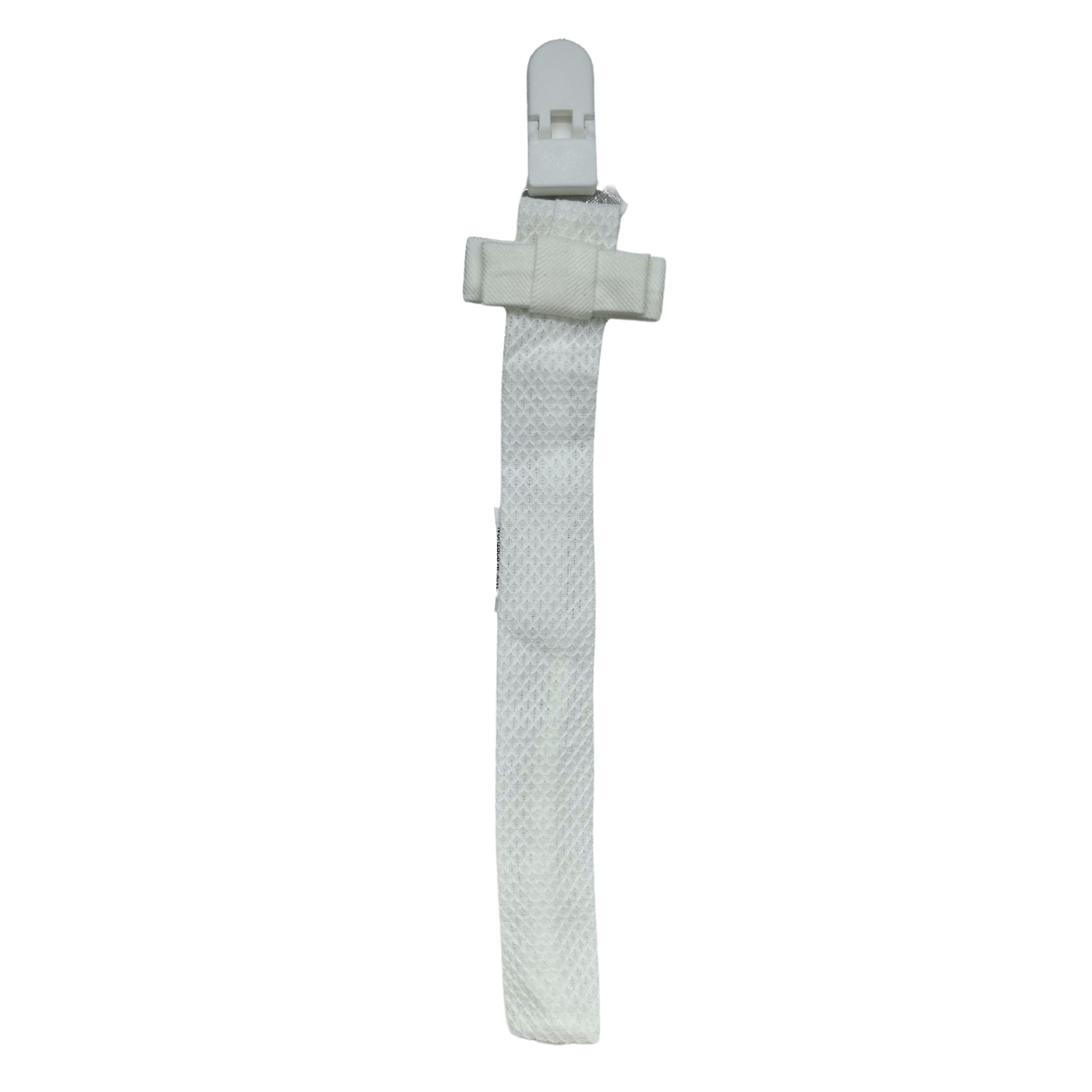 Schattig speenkoord van wit gewafeld katoen, hij is afgewerkt met een grote witte strik van dezelfde stof. Maak het koord compleet en laat hem personaliseren met de naam van het kindje in blok of sierletters.