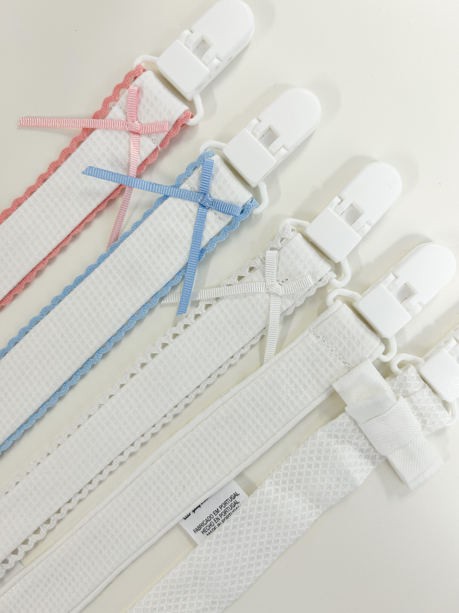 Schattig speenkoord van wit gewafeld katoen, hij is afgewerkt met een lichtblauw biesje en strik.