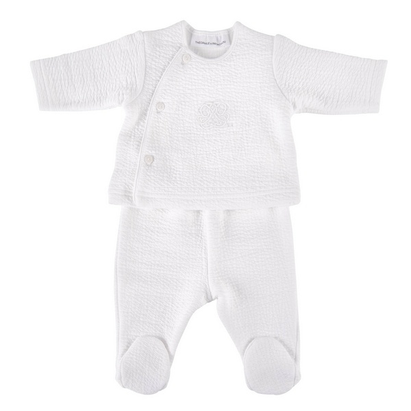 Dit prachtige tweedelige pakje van het merk Theophile & Patachou is van een gewafelde jersey stof, de top is aan de voorkant versierd met een delicaat borduurwerk. Het pakje past perfect bij alle items uit de Cotton White collectie. En is zowel draagbaar voor een jongen als meisje.
