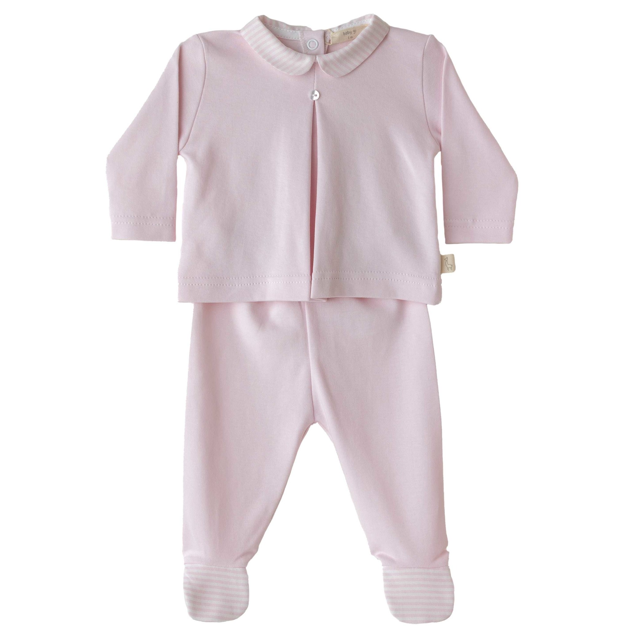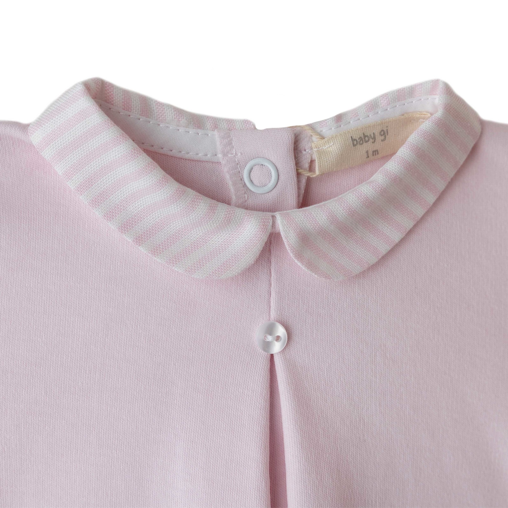 Mooi tweedelig pakje van het merk Baby Gi. De top van het setje heeft een chique ronde kraag met roze/wit streep patroon ditzelfde detail zie je terug op de voetjes van het broekje. De top heeft drukknoopjes aan de achterzijde, voor het makkelijk aan & uitkleden van de baby.