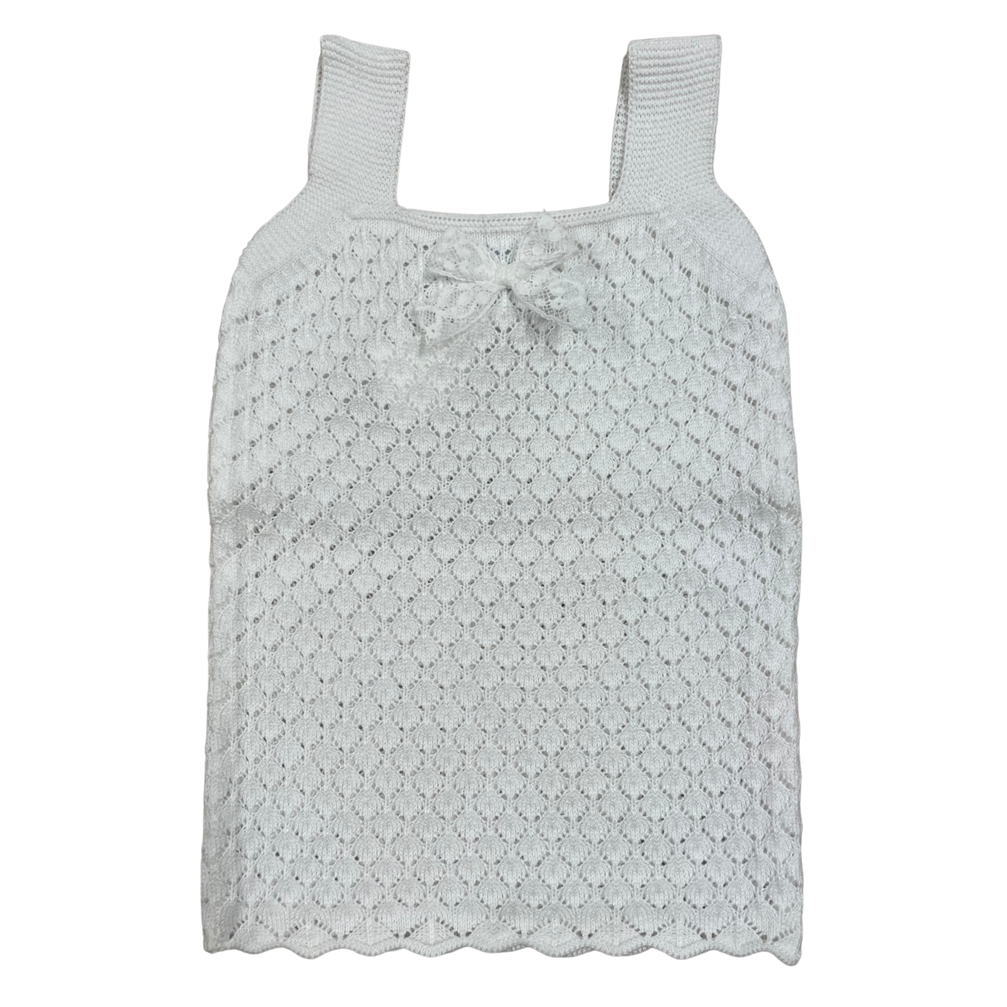Mooi tweedelige set bestaande uit een gebreid topje en broekje. De top is afgewerkt met een strik.
