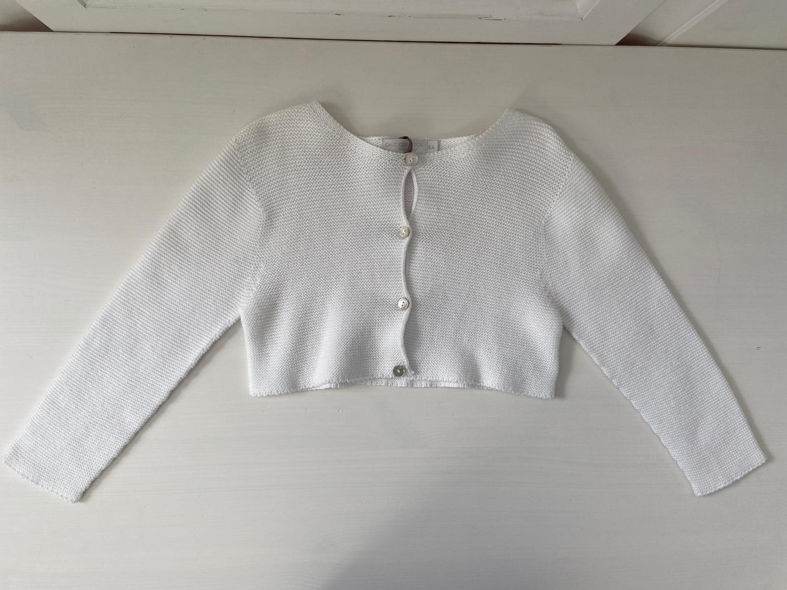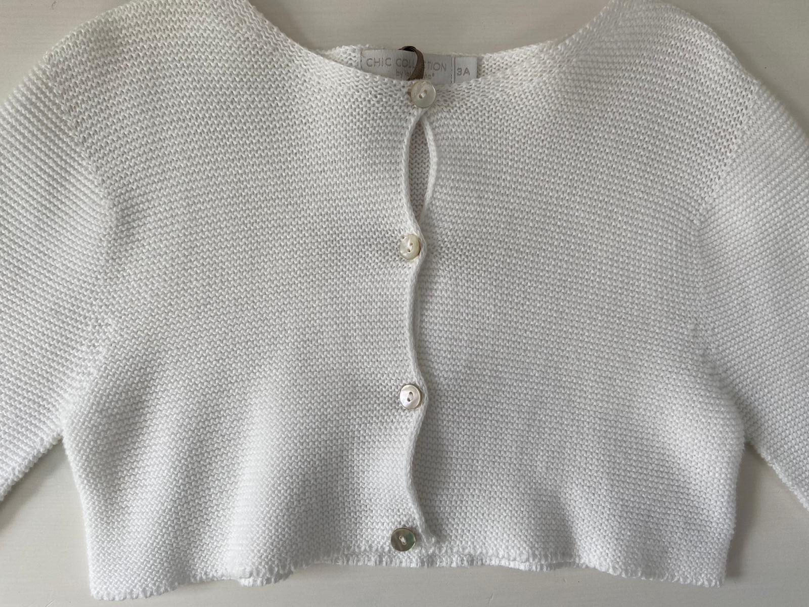 Wit gebreid vestje met parelmoerknopen.