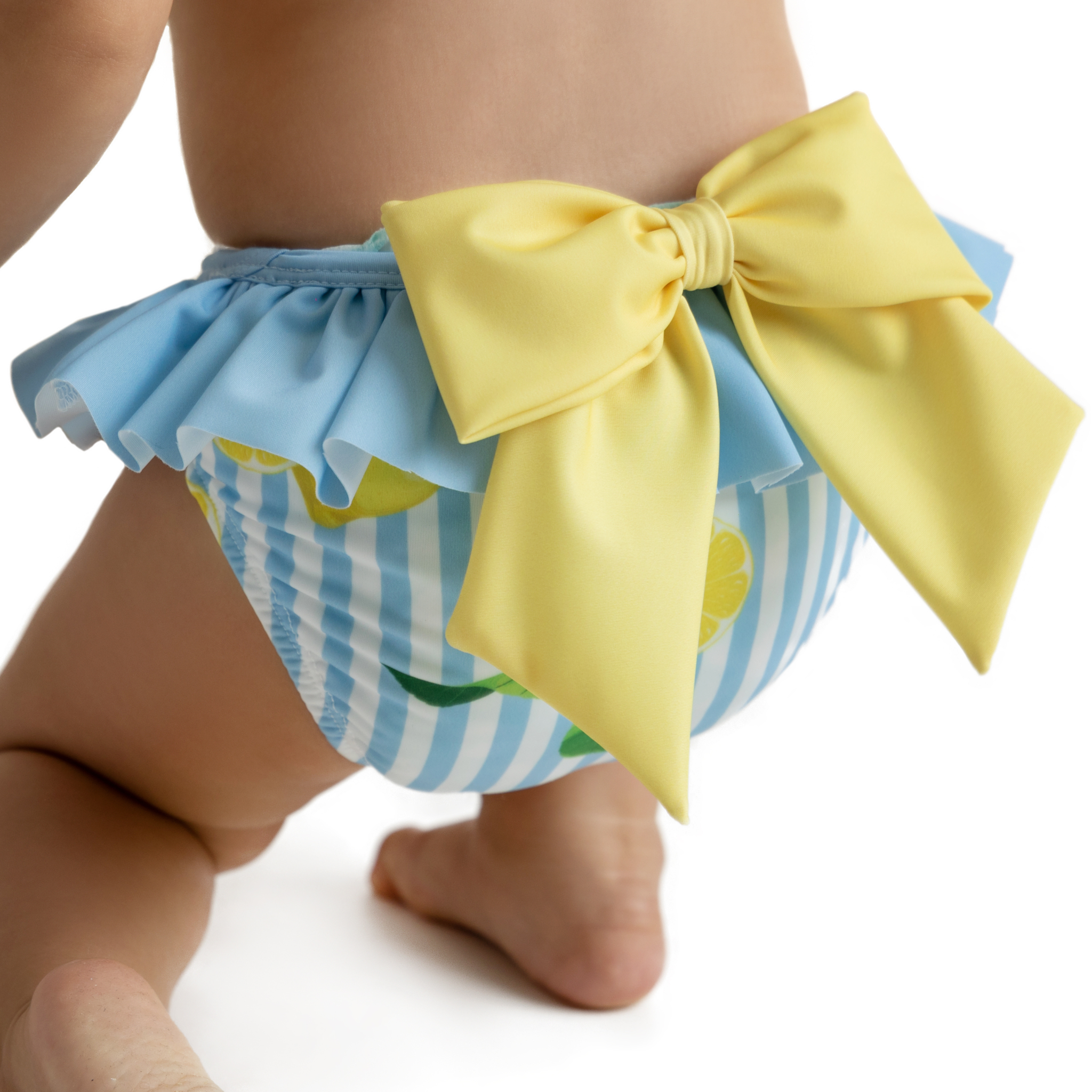 Mooi zwemshort voor jongens met lemons patroon. De short kan gematcht worden met het badpak van de zus of de bloomer voor het zusje die hetzelfde lemons patroon heeft. Van het merk Meia Pata.