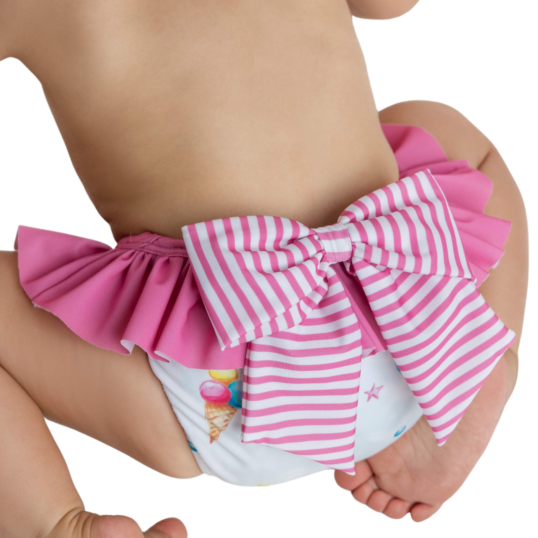 Leuk en mooi badpak voor meisjes. Met ijsjes patroon. Dit badpak kan gematcht worden met de bloomer voor het zusje die hetzelfde ijsjes patroon heeft. Van het merk Meia Pata.